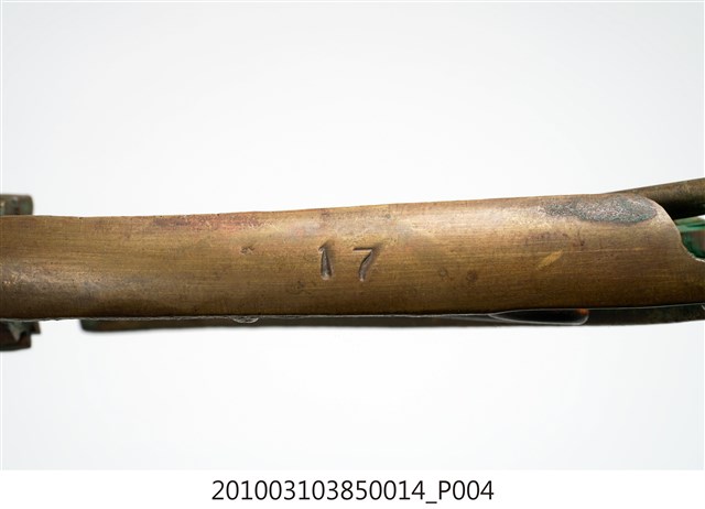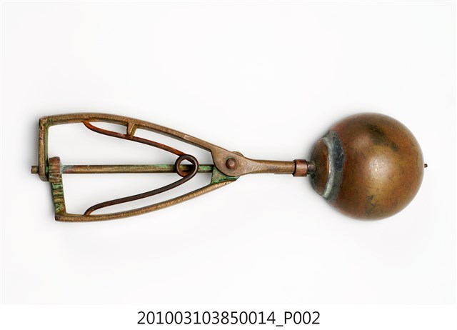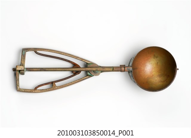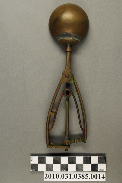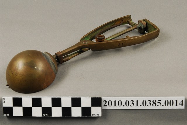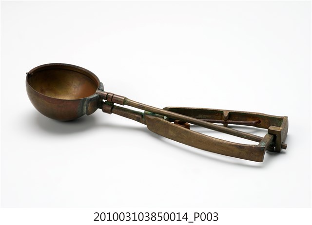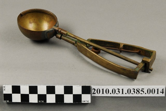 本件為天霸王芋冰販售器具組配件之一,為挖大球芋冰的銅冰杓,以黃銅製成,杓口直徑約5.3公分。冰杓由兩個交疊的半圓球形杓與杓柄組成,杓柄側邊壓有數字「17」,是採用簡單機械原理的器具。使用時,先將杓插入冰淇淋中,手部緊壓杓柄,杓柄會牽動轉軸,帶動上方的半圓球形杓轉動,接著舀起冰淇淋,再將加緊得杓柄鬆開,轉動的半圓球形杓及轉回原位,舀好的冰淇淋球便掉入備好的容器中。