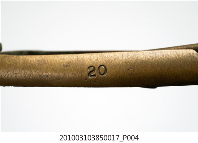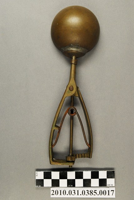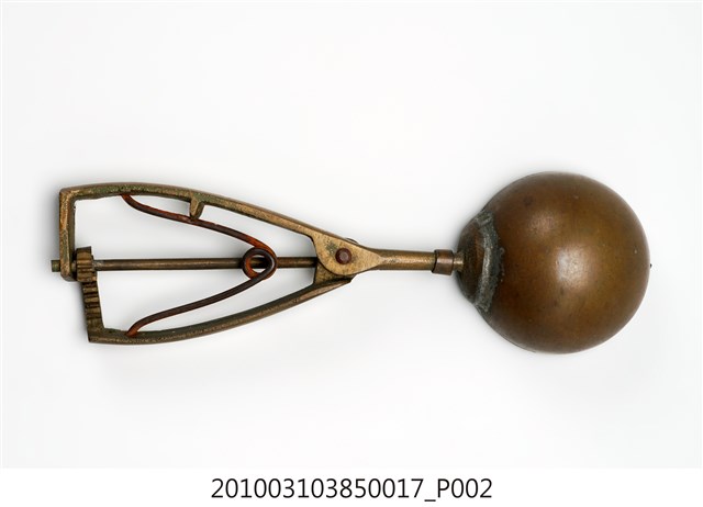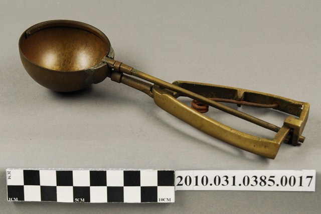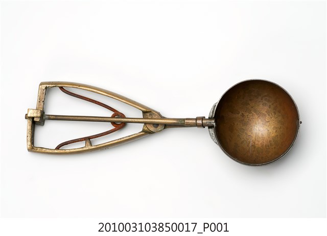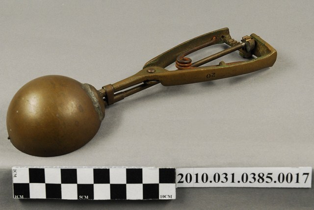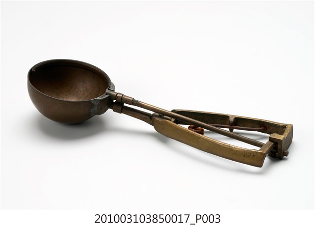 本件為天霸王芋冰販售器材組配件之一,為挖大球芋冰的銅冰杓,以黃銅製成,杓口直徑約6.1公分。冰杓由兩個交疊的半圓球形杓與杓柄組成,杓柄側邊壓有數字「20」,是採用簡單機械原理的器具。使用時,先將杓插入冰淇淋中,手部緊壓杓柄,杓柄會牽動轉軸,帶動上方的半圓球形杓轉動,接著舀起冰淇淋,再將加緊得杓柄鬆開,轉動的半圓球形杓及轉回原位,舀好的冰淇淋球便掉入備好的容器中。