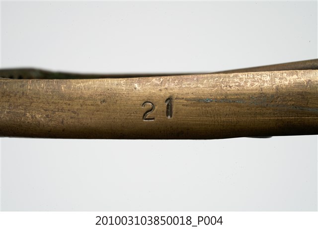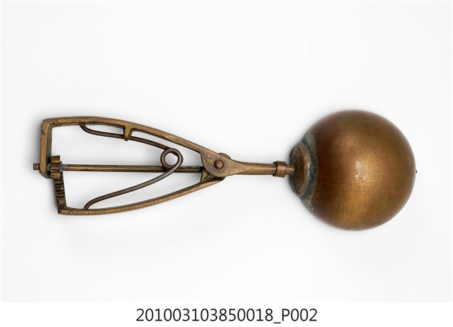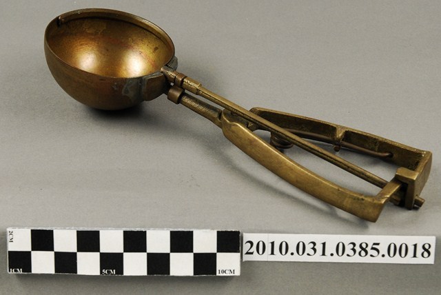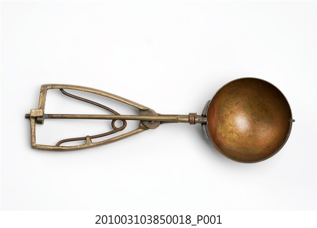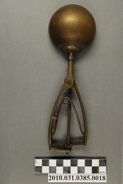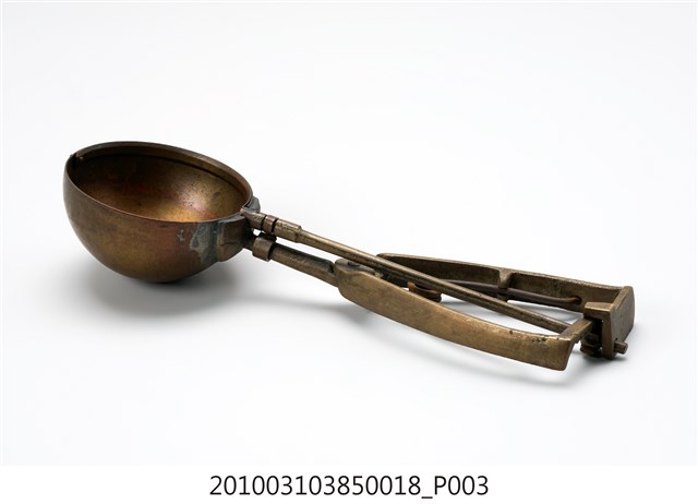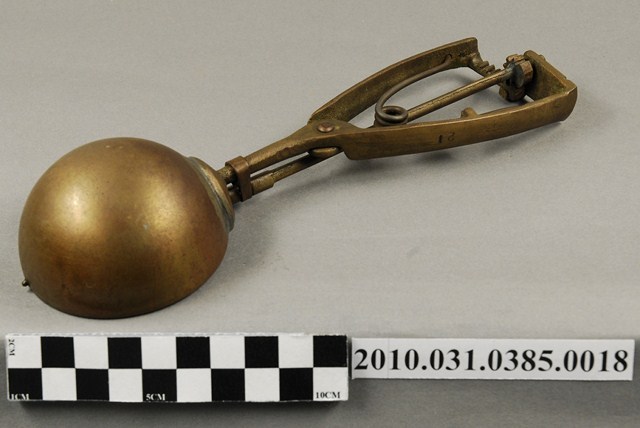 本件為天霸王芋冰販售器具組配件之一,為挖大球芋冰的銅冰杓,以黃銅製成,杓口直徑約6.5公分。冰杓由兩個交疊的半圓球形杓與杓柄組成,杓柄側邊壓有數字「21」,是採用簡單機械原理的器具。使用時,先將杓插入冰淇淋中,手部緊壓杓柄,杓柄會牽動轉軸,帶動上方的半圓球形杓轉動,接著舀起冰淇淋,再將加緊得杓柄鬆開,轉動的半圓球形杓及轉回原位,舀好的冰淇淋球便掉入備好的容器中。