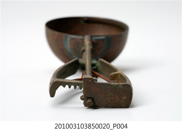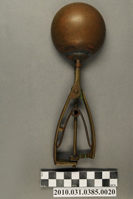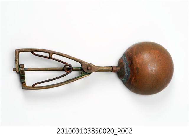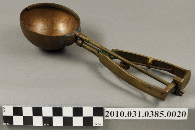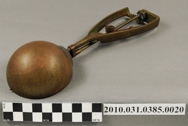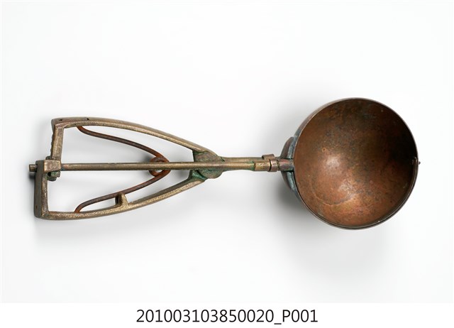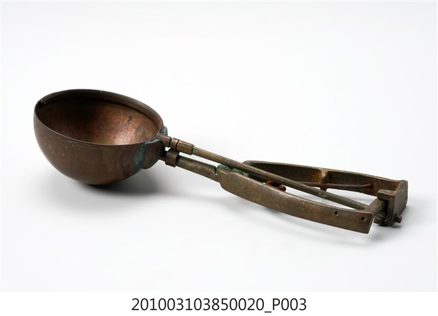 本件為天霸王芋冰販售器具組配件之一,為挖大球芋冰的銅冰杓,以黃銅製成,杓口直徑約7公分。冰杓由兩個交疊的半圓球形杓與杓柄組成,杓柄側邊壓有數字「23」,是採用簡單機械原理的器具。使用時,先將杓插入冰淇淋中,手部緊壓杓柄,杓柄會牽動轉軸,帶動上方的半圓球形杓轉動,接著舀起冰淇淋,再將加緊得杓柄鬆開,轉動的半圓球形杓及轉回原位,舀好的冰淇淋球便掉入備好的容器中。