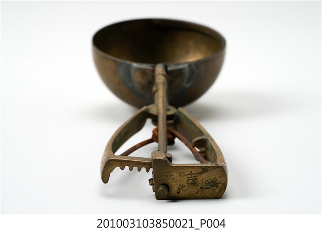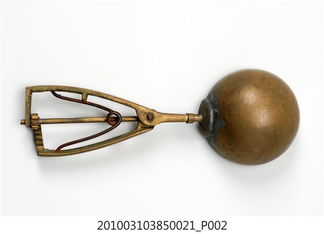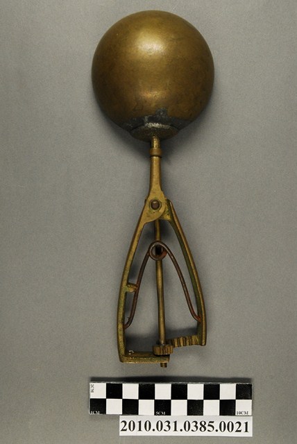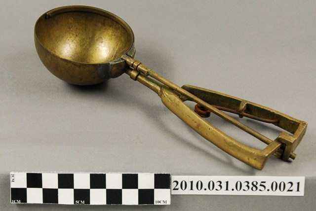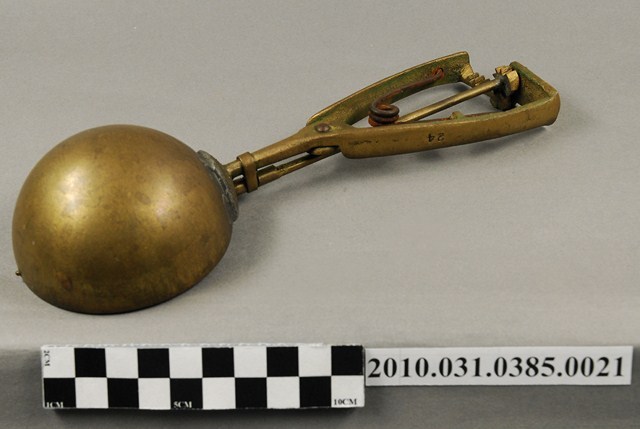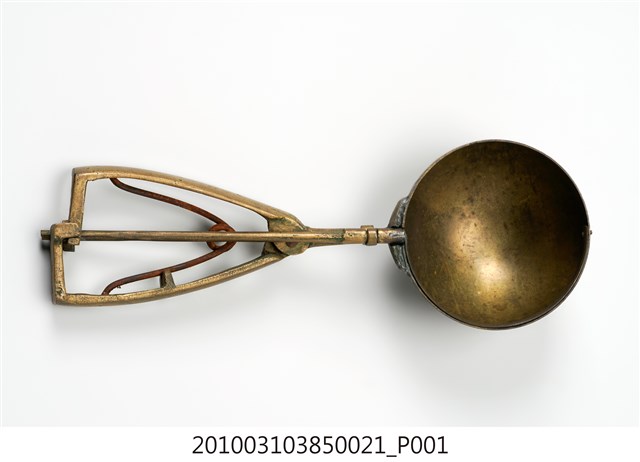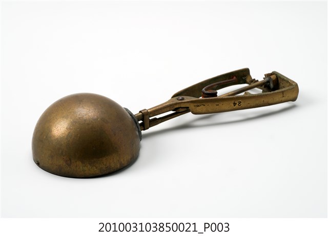 本件為天霸王芋冰販售器具組配件之一,為挖大球芋冰的銅冰杓,以黃銅製成,杓口直徑約7.4公分。冰杓由兩個交疊的半圓球形杓與杓柄組成,杓柄側邊壓有數字「24」,是採用簡單機械原理的器具。使用時,先將杓插入冰淇淋中,手部緊壓杓柄,杓柄會牽動轉軸,帶動上方的半圓球形杓轉動,接著舀起冰淇淋,再將加緊得杓柄鬆開,轉動的半圓球形杓及轉回原位,舀好的冰淇淋球便掉入備好的容器中。
