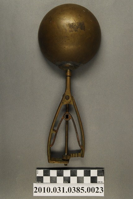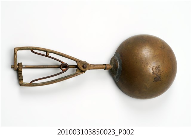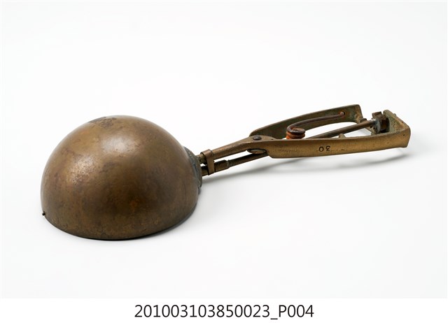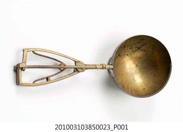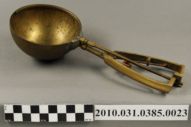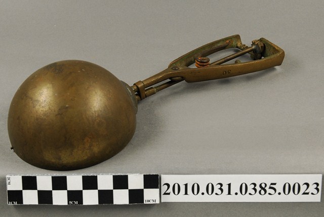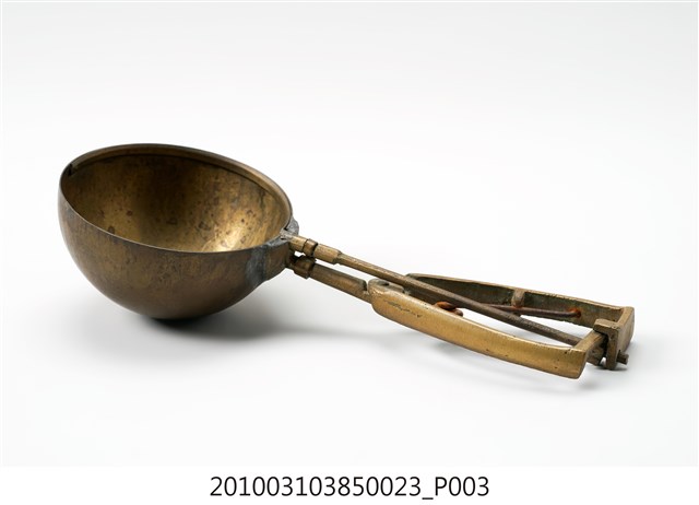 本件為天霸王芋冰販售器具組配件之一,為挖超大球芋冰的銅冰杓,以黃銅製成,杓口直徑約9.1公分。冰杓由兩個交疊的半圓球形杓與杓柄組成,杓柄側邊壓有數字「30」,是採用簡單機械原理的器具。使用時,先將杓插入冰淇淋中,手部緊壓杓柄,杓柄會牽動轉軸,帶動上方的半圓球形杓轉動,接著舀起冰淇淋,再將加緊得杓柄鬆開,轉動的半圓球形杓及轉回原位,舀好的冰淇淋球便掉入備好的容器中。