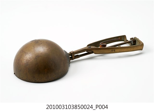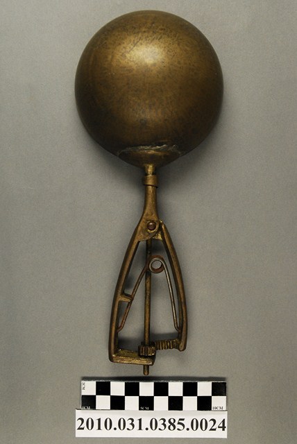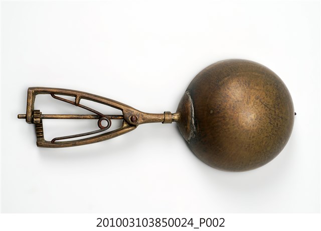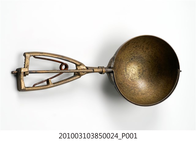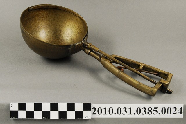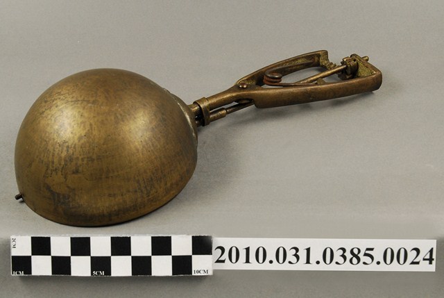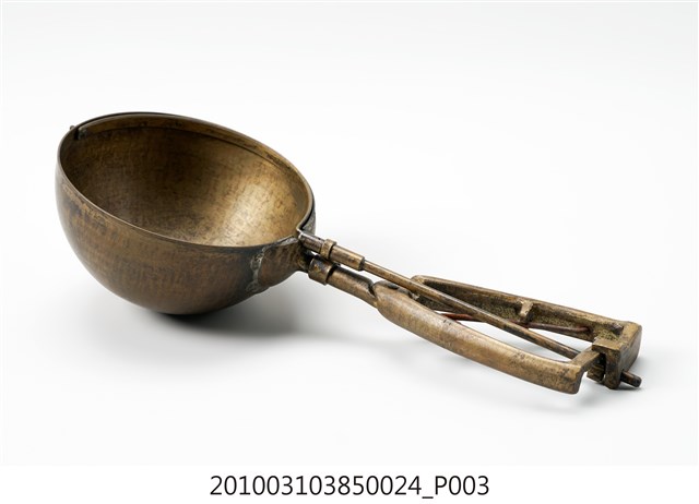 本件為天霸王芋冰販售器具組配件之一,為挖超大球芋冰的銅冰杓,以黃銅製成,杓口直徑約10公分。冰杓由兩個交疊的半圓球形杓與杓柄組成,是採用簡單機械原理的器具。使用時,先將杓插入冰淇淋中,手部緊壓杓柄,杓柄會牽動轉軸,帶動上方的半圓球形杓轉動,接著舀起冰淇淋,再將加緊得杓柄鬆開,轉動的半圓球形杓及轉回原位,舀好的冰淇淋球便掉入備好的容器中。