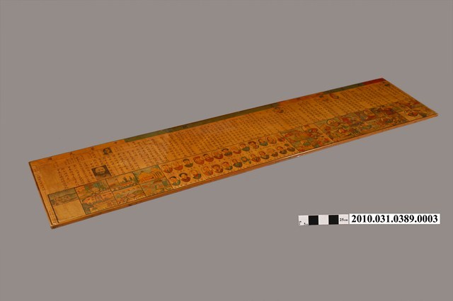本文物為教學用中國史年表3。年表為木製品,長方形。年表上有朝代、人名年代、君王圖片、重要人物或事件圖片、政事紀要等內容,圖片為彩色。中國史年表3時段為宋、元、明、清、中華民國。
