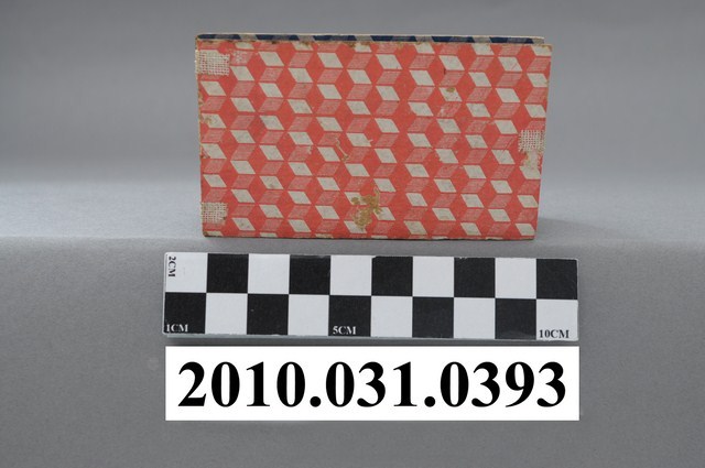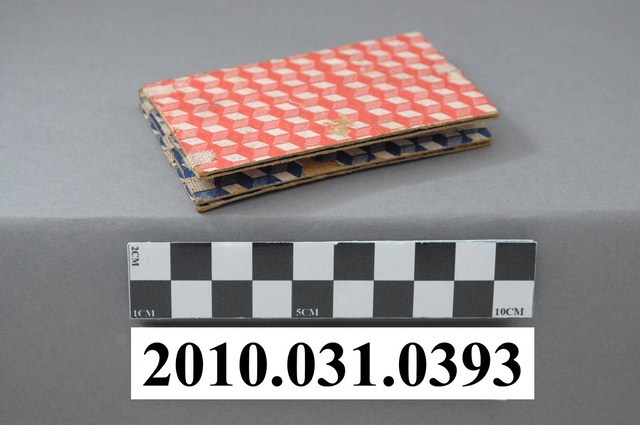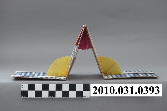 1.本物件為翻轉板紙花,紙質材質。該物件為四面紙板,外觀為紅色及藍色立體格狀,紙板與紙板交合之間設有紙扇,分別為紅色、白色、藍色、黃色。