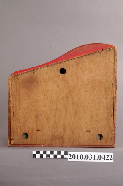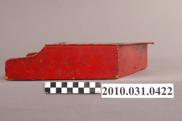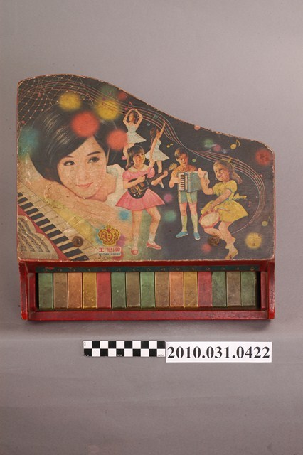 本物件為玩具鋼琴,複合材質。該物件為一架鋼琴,外觀主要為紅色,鋼琴上方面版印有一名女性輕倚在鍵盤上,兩名芭蕾舞女孩、三名孩童正在使用樂器,且有「王冠牌」、「CROWN BRAND」字樣。該鍵盤按鍵顏色繽紛,鍵盤上方可見數字1-7。