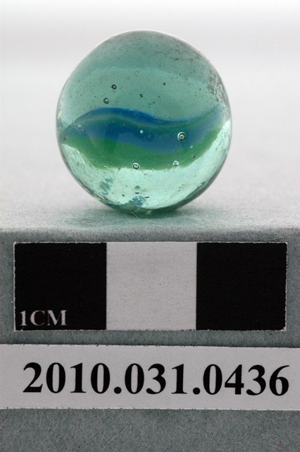 1.本物件為花彩玻璃彈珠,球體,材質為玻璃,外部有稍微凹陷,表面呈透明,有些許污班,可透視內部,並於內部鑲嵌藍、白、綠三色玻璃材質,呈波浪狀,形如花瓣、楊桃,內部佈有部分氣泡。