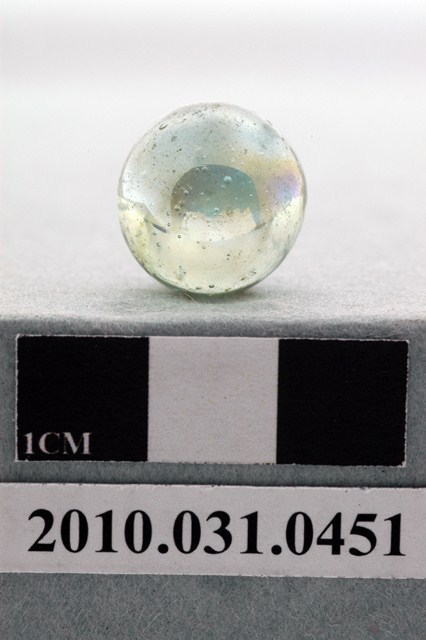 1.本物件為透明玻璃彈珠,球體,材質為玻璃,表面呈透明,部分表面有類似油漬之反光,可透視內部,並於內部鑲嵌形狀不明物,亦不詳其材質,內部佈有部分氣泡。