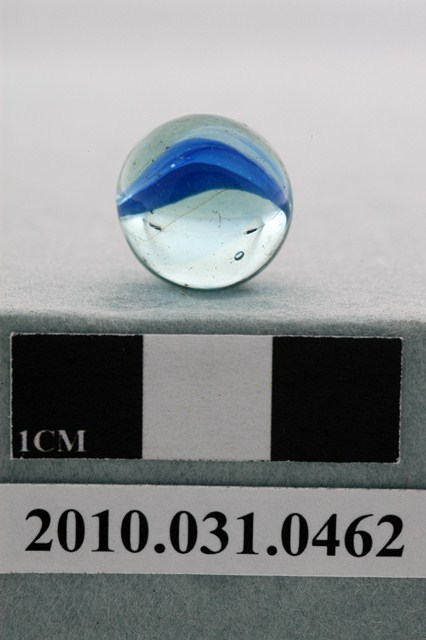1.本物件為花彩玻璃彈珠,球體,材質為玻璃,表面呈透明,可透視內部,並於內部鑲嵌藍、白、淡藍三色玻璃材質,呈波浪狀,形如花瓣、楊桃,內部佈有部分氣泡。
