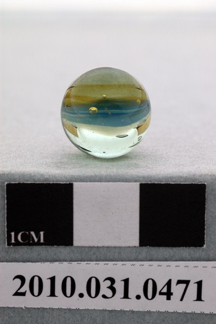 1.本物件為花彩玻璃彈珠,球體,材質為玻璃,表面呈透明,可透視內部,內部顏色不均勻,並於內部鑲嵌白、藍、淡藍三色玻璃材質,呈波浪狀,形如花瓣、楊桃,內部佈有部分氣泡。