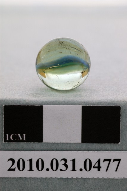 1.本物件為花彩玻璃彈珠,球體,材質為玻璃,表面呈透明,有些許污斑,可透視內部,內部顏色不均勻,並於內部鑲嵌白、藍、淡綠三色玻璃材質,呈波浪狀,形如花瓣、楊桃,內部佈有部分氣泡。