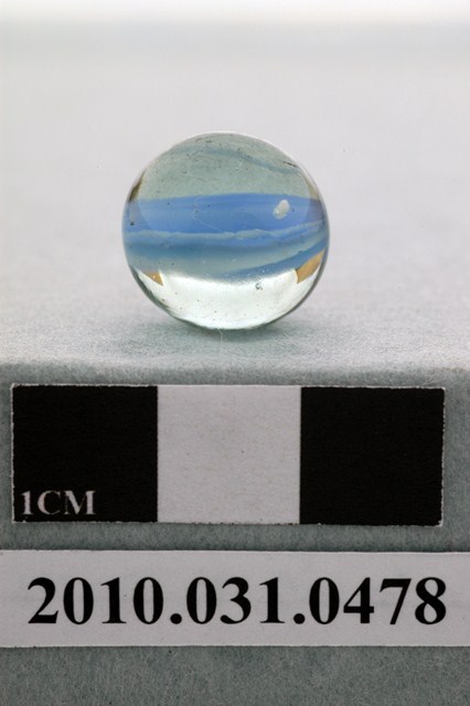 1.本物件為花彩玻璃彈珠,球體,材質為玻璃,表面呈透明,可透視內部,並於內部鑲嵌白、藍、淡藍三色玻璃材質,呈波浪狀,形如花瓣、楊桃,內部佈有部分氣泡。