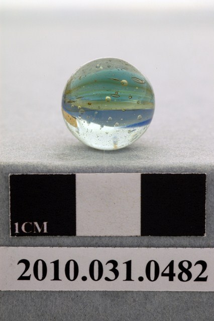 1.本物件為花彩玻璃彈珠,球體,材質為玻璃,表面呈透明,有些許污斑,可透視內部,內部顏色不均勻,並於內部鑲嵌白、藍、淡藍三色玻璃材質,呈波浪狀,形如花瓣、楊桃,內部佈有部分氣泡。