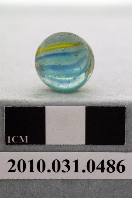 1.本物件為花彩玻璃彈珠,球體,材質為玻璃,表面呈透明,有些許污斑,可透視內部,並於內部鑲嵌淡藍、藍、黃三色玻璃材質,呈波浪狀,形如花瓣、楊桃,內部佈有部分氣泡。