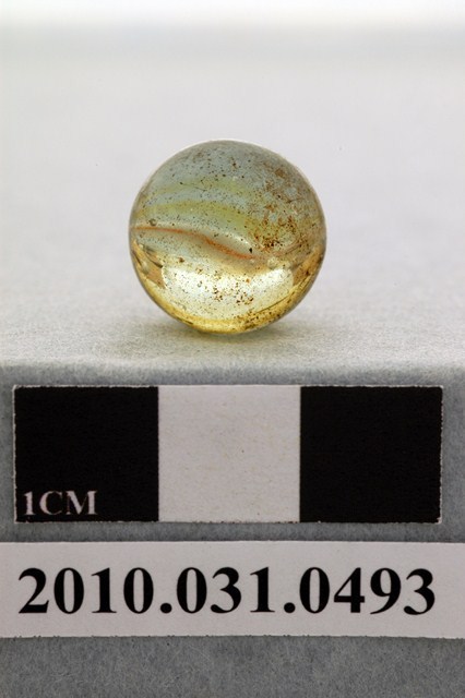 1.本物件為花彩玻璃彈珠,球體,材質為玻璃,表面呈透明,有嚴重污斑,可透視內部,並於內部鑲嵌白、黃、橘三色玻璃材質,呈波浪狀,形如花瓣、楊桃,內部佈有部分氣泡。