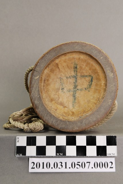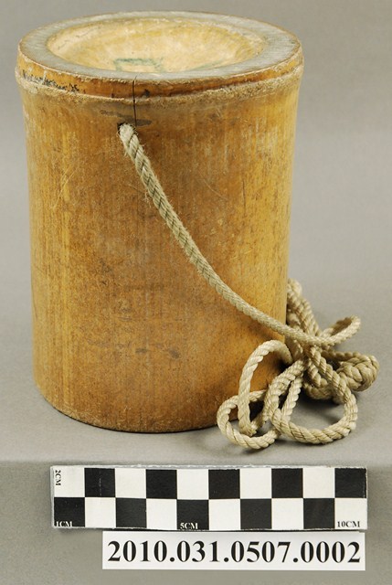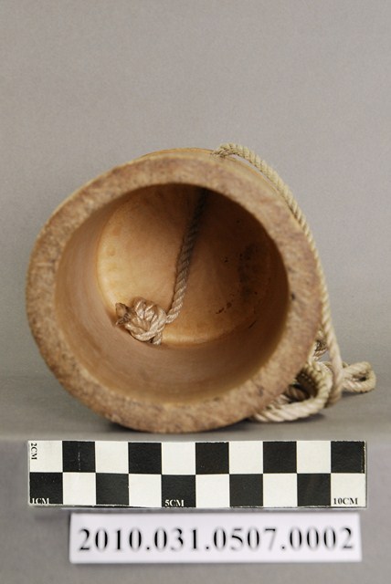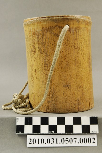 1.本物件為竹筒高蹺之單腳組件,材質為竹,為平整砍下一段竹竿所成之竹筒,竹筒為空心,上端有凹陷底部,底部上有以藍色塗料寫上「中」字樣,下端則無底,可直視竹筒內部情形,於上端挖鑿兩洞,並各以一條麻繩穿進,並於竹筒內部打結用以固定。