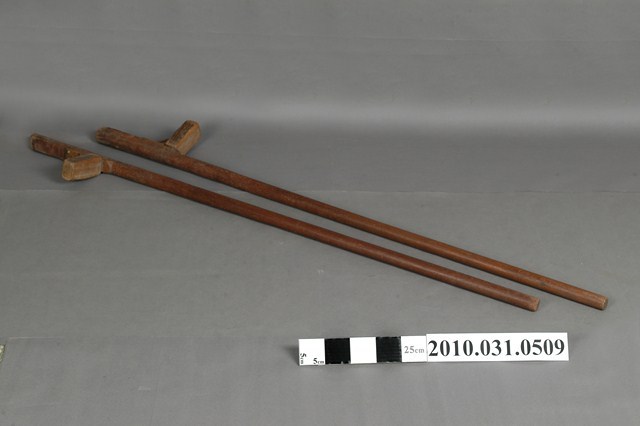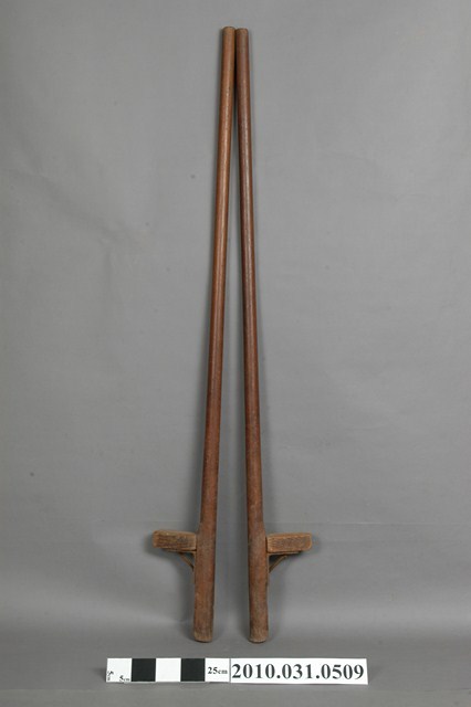 1.本物件為木製高蹺,為兩件木製高蹺單腳組件組合而成,兩件無明顯差異,材質皆為木質,皆為一段等長木棍,然木棍皆上端較細、下端較粗,與一組踩踏構造物組成,木棍為深色,踩踏構造物為一深色木塊及L型鐵片與數顆釘子構成,組裝於木棍下端,用以做為踩踏點,並能平穩支撐由上而下的作用力。