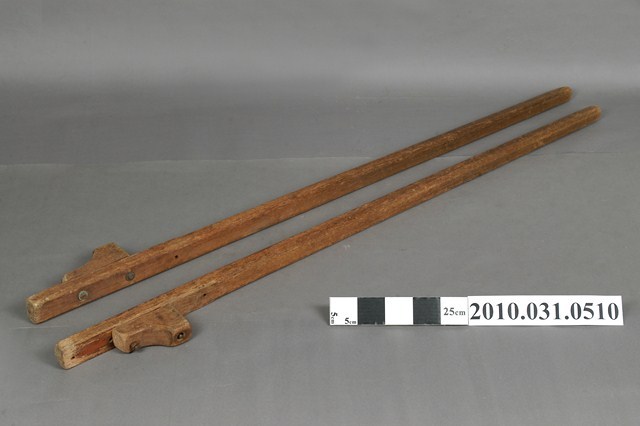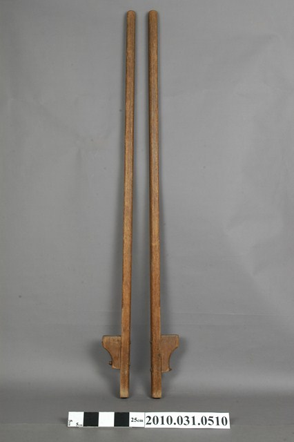 1.本物件為木製高蹺,為兩件木製高蹺單腳組件組合而成,兩件無明顯差異,材質皆為木質,皆為一段等長長方體木棍,與一組踩踏構造物組成,木棍為淺棕色,踩踏構造物為一塊類似L型之木塊與兩顆釘子構成,組裝於木棍下端,L之面積較大底部向上,面積較小之頂部向下,並以兩顆釘子釘於木棍上,用以做為踩踏點,並能平穩支撐由上而下的作用力。