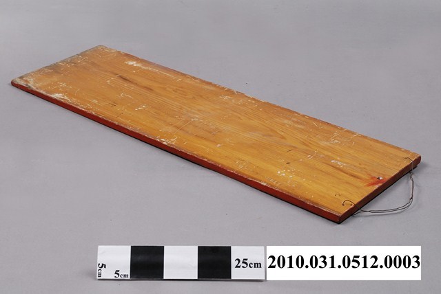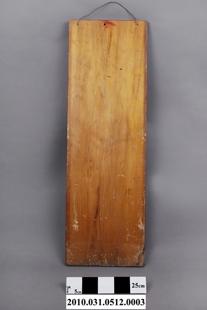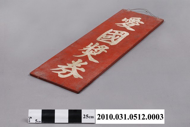 1.本物件為愛國獎券木牌,木牌一面為紅色底,寫有白色字「愛國獎券」,另一面為原木牌色調,頂端打洞有鐵絲穿過。