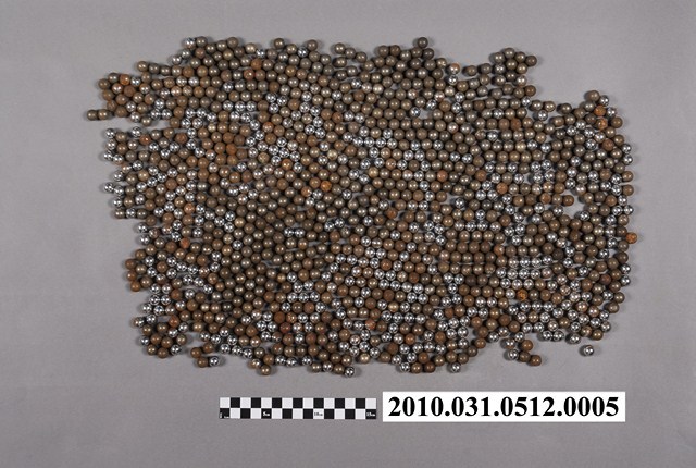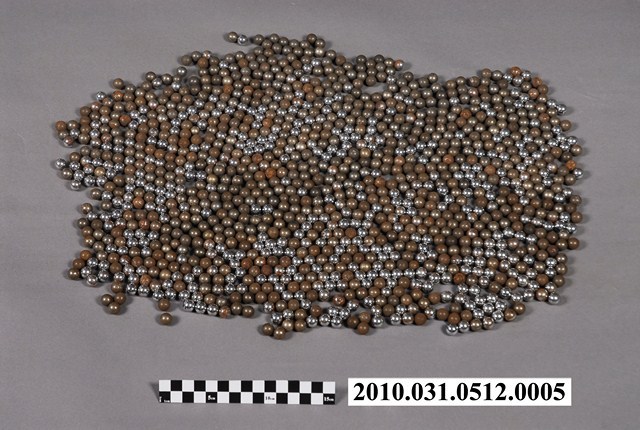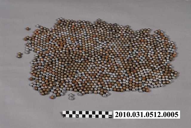 本物件為小鋼珠,數量眾多之小鋼珠有銀白色及褐色兩款顏色,褐色亦有可能為生鏽所導致,為彈珠臺使用之鋼珠。