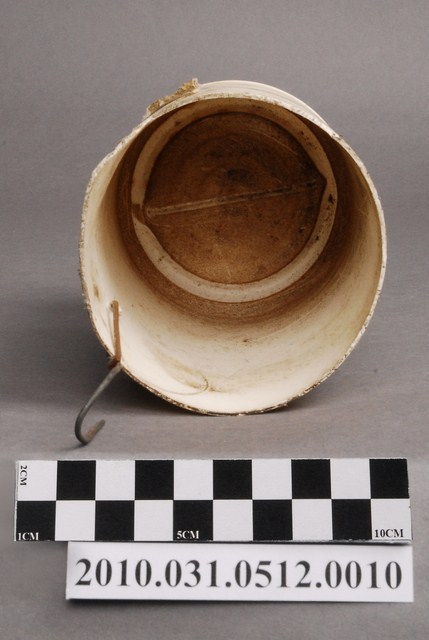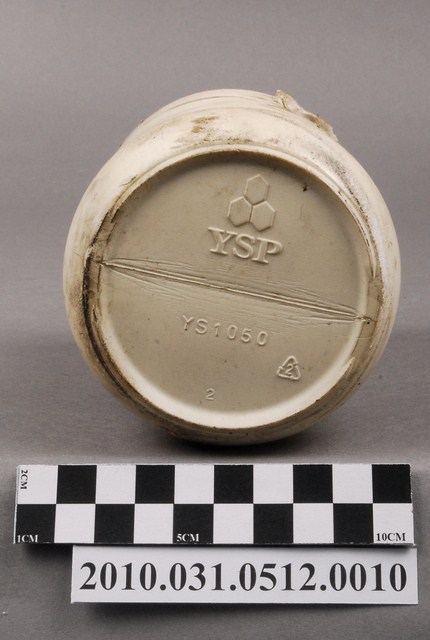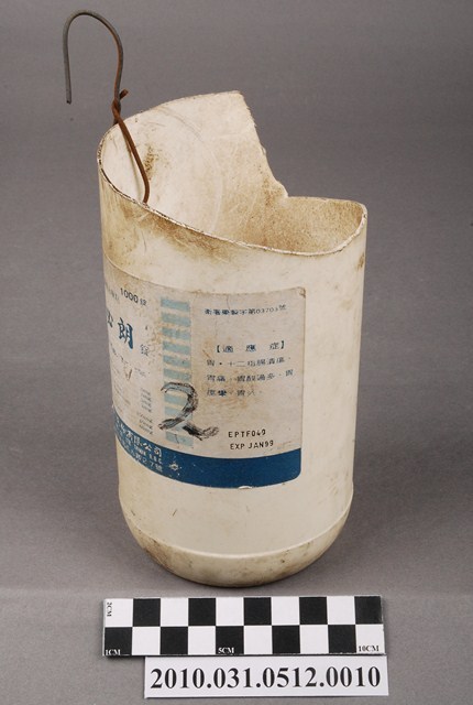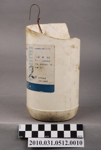 本物件為不規則形開口之圓柱體白色塑膠藥桶,桶子開口裁剪成不規則樣,外觀有多處刮痕及污漬,打一洞穿有鐵絲,並貼有一張「胃必朗」藥品的說明,桶子內底部有污漬。桶子外底部有一橫紋,印有六邊形商標圖案及「YSP」、「YS1050」等字樣。