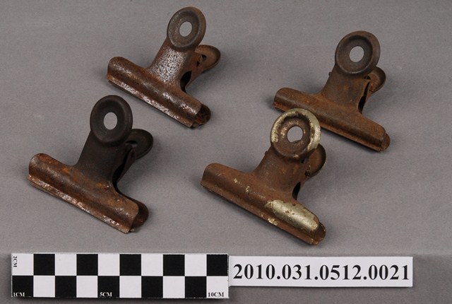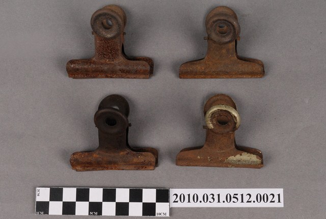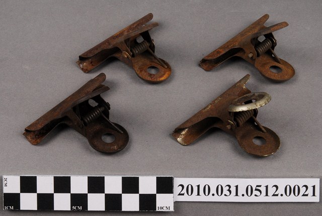 本物件為4只圓形生鏽鐵夾,4只圓形鐵夾,原為銀白色,因鏽蝕外觀多以呈現鐵鏽褐色,彈簧完整,夾口已略有歪斜,不完全密合。