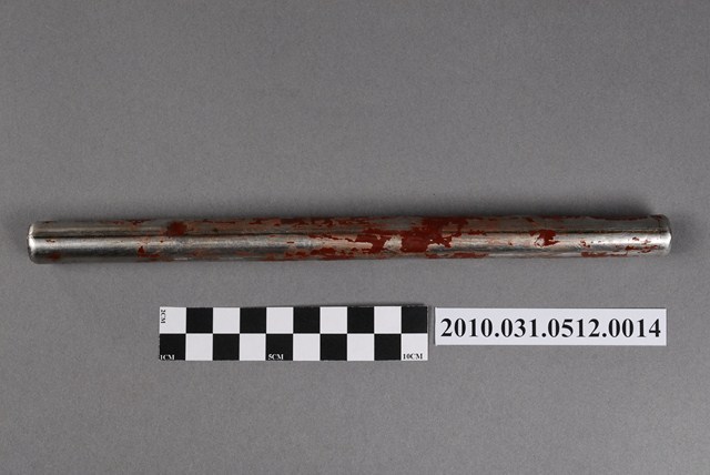 本物件為圓柱體細長金屬管,外觀平滑但有掉漆,紅色漆多已脫落,可看見原銀白色調,有多處刮痕,管身有一條橫切線,兩側皆有開口。