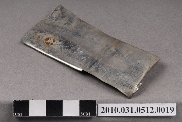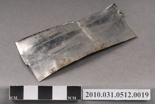 本物件為銀白色長方形金屬片,形狀不方正,邊緣裁剪不整齊,表面不平整,有多處鏽蝕、刮痕及凹痕。