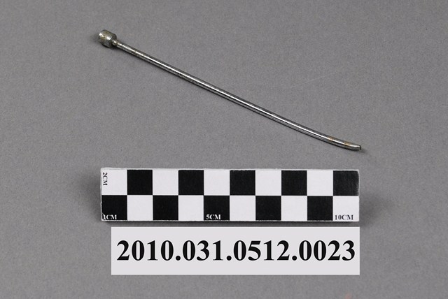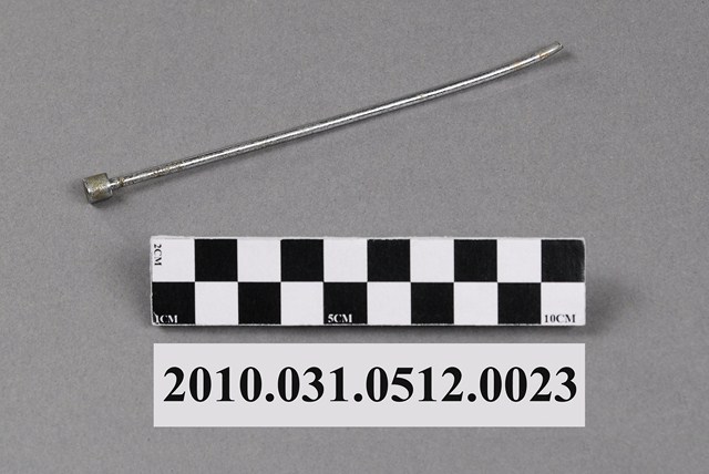 本物件為金屬條,長條之銀白色金屬條,一側有圓柱形狀零件套住,另一側微彎曲且無被包覆。整體有多處鏽蝕。