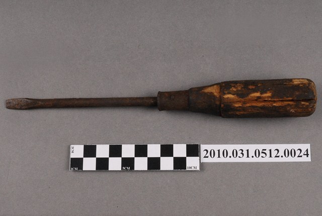 本物件為一字型螺絲起子,鎖螺絲的鐵棒已鏽蝕,鐵棒與把手銜接處亦鏽蝕,木頭把手的部分有多處污漬,原色多被覆蓋,僅剩少許可見原木頭色。