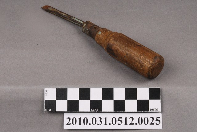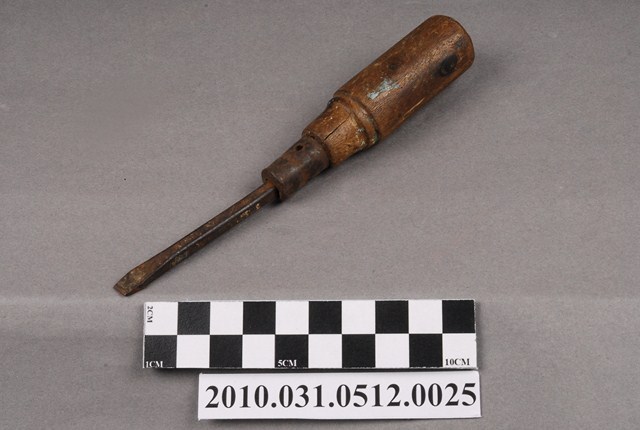 本物件為一字型螺絲起子,鎖螺絲的鐵棒已鏽蝕且歪斜,鐵棒與把手銜接處亦鏽蝕,木頭把手的部分有些許污漬,可見原木頭色。