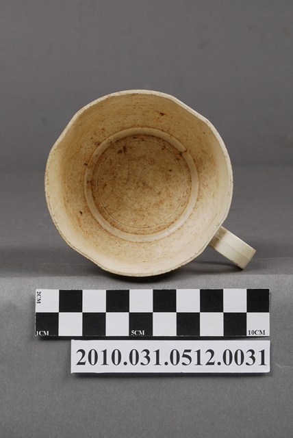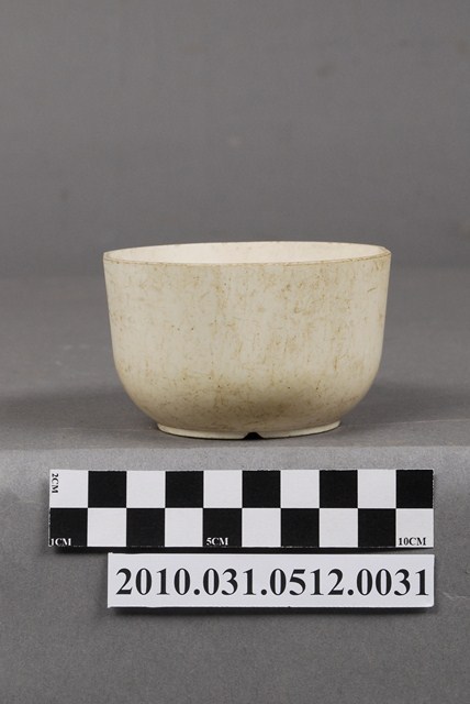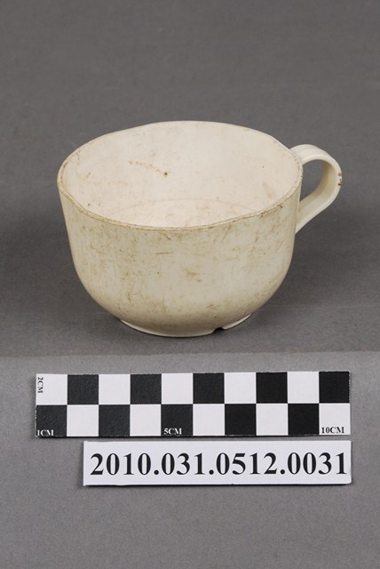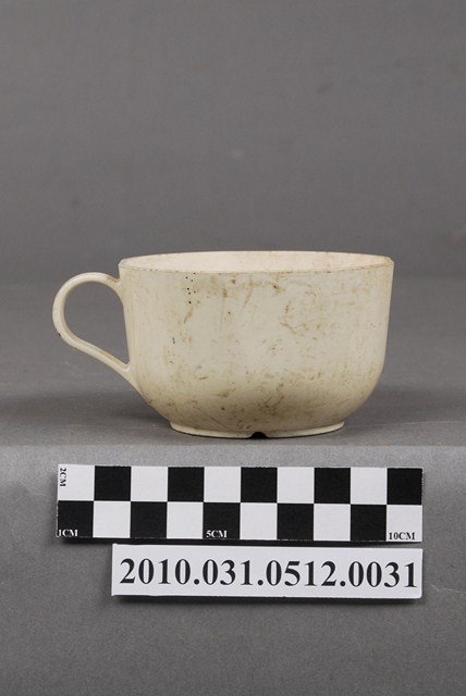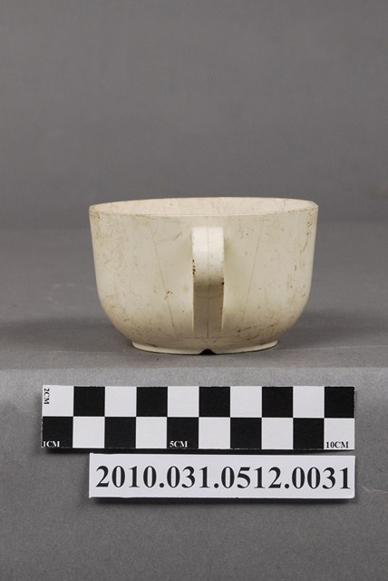 本物件為單耳寬口純白色塑膠杯,僅單一側的把手,杯緣非正圓,為對稱的弧形,杯耳、杯身、杯內、杯底皆有許多刮痕及污漬,杯底有墊高,印有英文字,但模糊不易辨識。