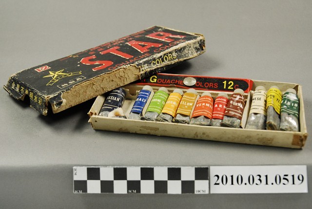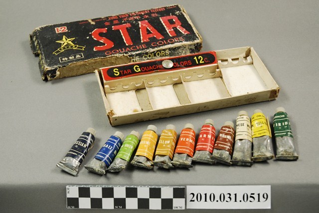 本文物為金星不透明水彩。包裝為紙製品。盒蓋為黑色表面,印有金星不透明水彩、12、特製品、STAR、GOUACHE COLORS等字樣。盒蓋打開可見11條水彩與1顆圖釘,白色、綠色和黃色水彩較其他顏色水彩體積大。每條水彩軟管為銀色,外側包有該水彩色的紙捲,其上印有文字。盒身底部有手寫アエイ、20元字樣。