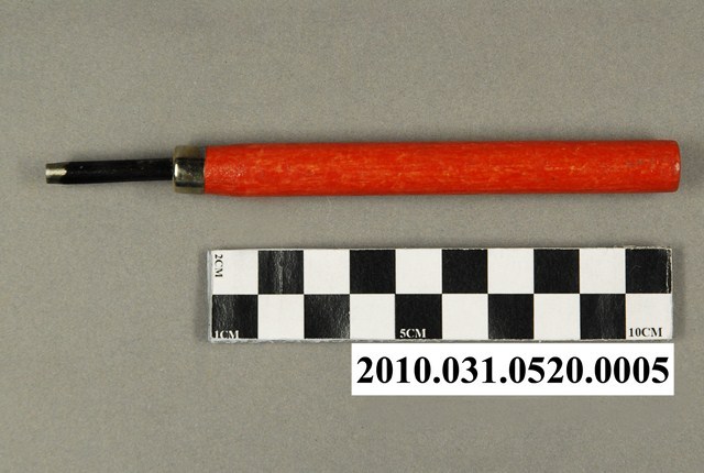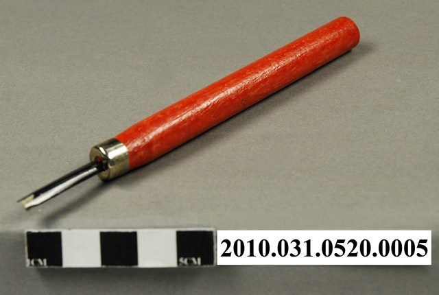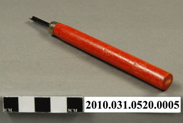 本文物為力大牌雕刻刀組的圓口刀。 力大牌雕刻刀組,一組十二支雕刻刀。為中小學生美術課、工藝課所用的學生雕刻刀。力大牌於1978年以後為亞柏工業有限公司的品牌,本件外盒標明製造商為得彰企業有限公司出品,為1978年以前製品。