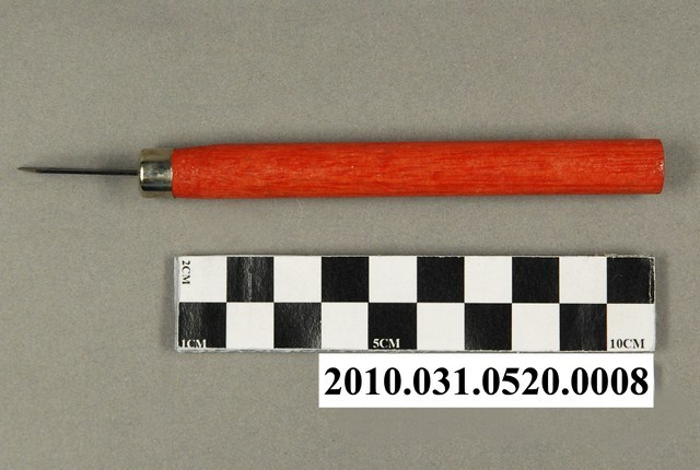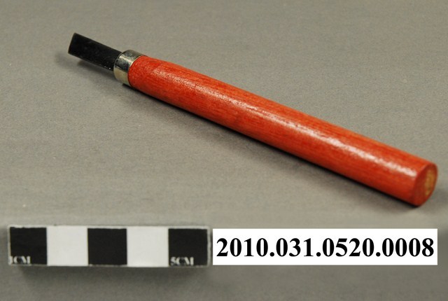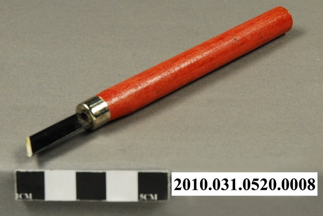 本文物為力大牌雕刻刀組的尖刀。 力大牌雕刻刀組,一組十二支雕刻刀。為中小學生美術課、工藝課所用的學生雕刻刀。力大牌於1978年以後為亞柏工業有限公司的品牌,本件外盒標明製造商為得彰企業有限公司出品,為1978年以前製品。