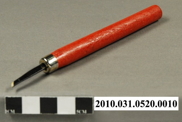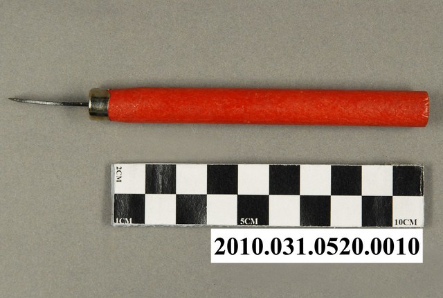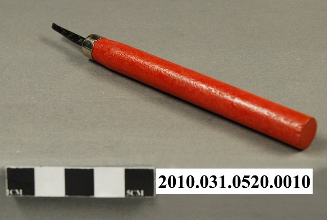 本文物為力大牌雕刻刀組的尖刀。 力大牌雕刻刀組,一組十二支雕刻刀。為中小學生美術課、工藝課所用的學生雕刻刀。力大牌於1978年以後為亞柏工業有限公司的品牌,本件外盒標明製造商為得彰企業有限公司出品,為1978年以前製品。