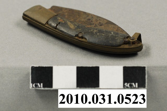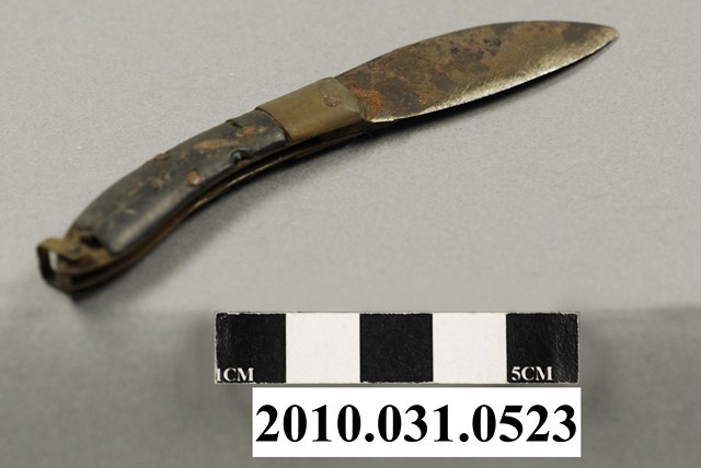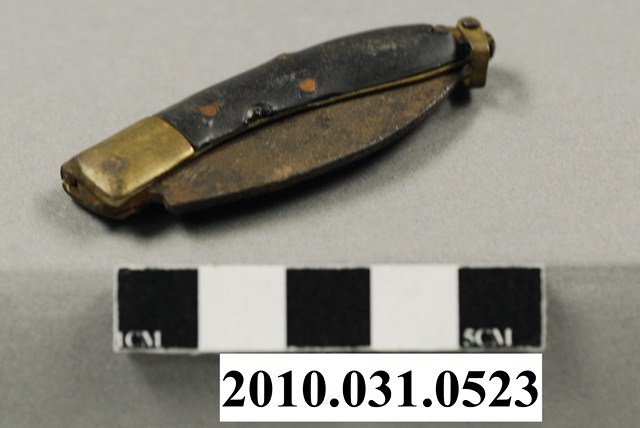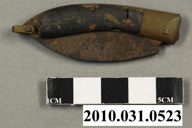本文物為裁紙刀。刀身可折,收納回刀柄,刀柄末端有一金屬環,可扣住刀身。刀柄內部為鐵製品,有生鏽痕跡,外部裝有黑色握柄。刀身呈弧形,有生鏽痕跡。
