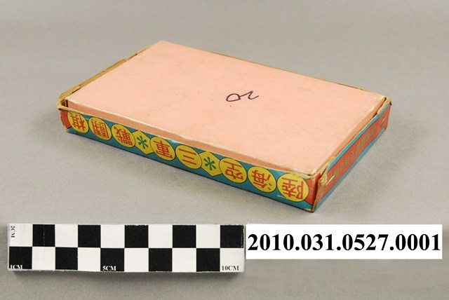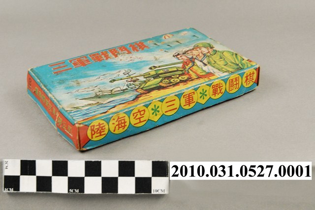 1.本物件為雷鳥體育文具廠有限公司出品之三軍戰鬥棋外盒。盒蓋上方印有紅字「三軍戰鬥棋」,由右至左圖樣分別為傘兵、陸海空三軍、坦克車、軍艦與軍機。盒蓋側邊分為長邊與短邊,長邊印有黃底紅字「陸海空三軍戰鬪棋」;短邊印有紅底綠字「雷鳥體育文具廠有限公司」。盒底為淺棕色,書有黑色數字「20」。