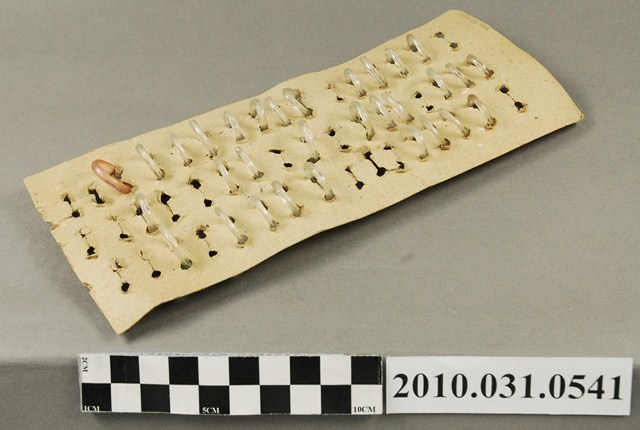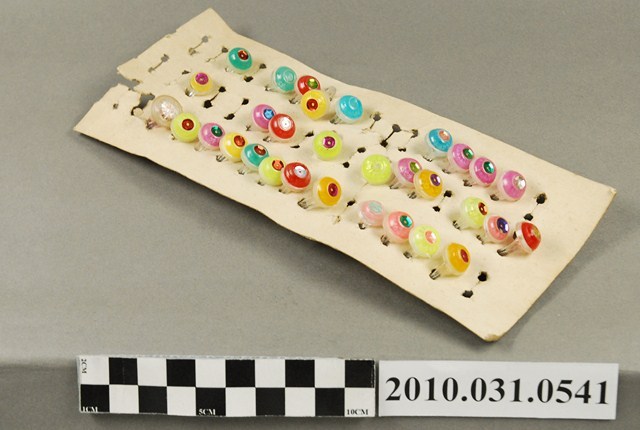本物件為玩具戒指,塑膠材質。該物件共有31個玩具戒指固定於1面空白紙板上,玩具戒指的外觀具有繽紛的色彩,包括黃色、綠色、粉色、藍色、紅色等。戒指頂端皆黏有1枚反光貼紙。