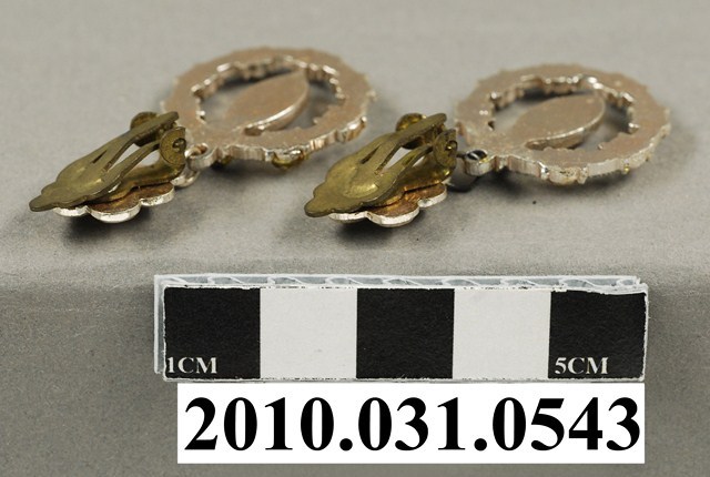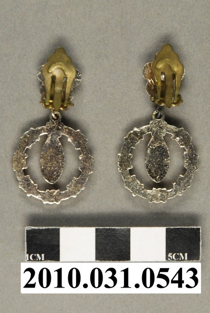 本物件為玩具夾式耳環,複合材質。該物件外觀為一對耳環,上方為花朵樣式,下方為圓形環狀,環狀裝飾中間有紅色寶石點綴。