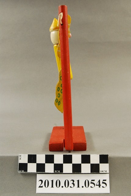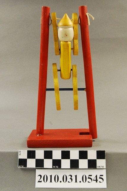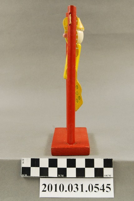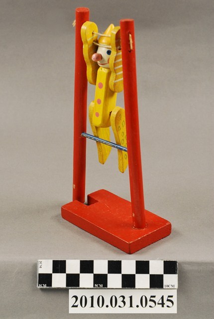 本物件為單槓小丑,木頭材質。該物件為一個小丑吊在單槓上面,該小丑外觀主要顏色為黃色,腹部有三個橘紅色的圓點,手部有白色橫條紋、腿部有綠色空心圓圈。單槓的外觀為橘紅色。
