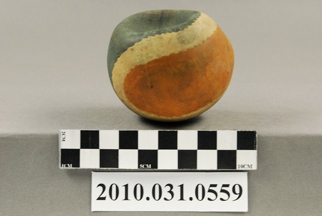 本物件為皮球,塑膠材質。該物件為一顆已洩氣的皮球,外觀有汙損。皮球顏色為橘色、白色、藍色組成,顏色交接處為鋸齒狀。