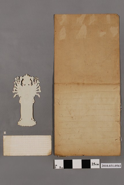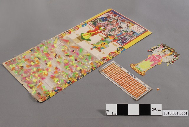 1.本物件為六合三俠傳抽當,共有1個物件本體、1面抽當紙張、1面人物角色單件。物件本體上方可見六合三俠傳人物以及「六合三俠傳」、「160當」、「5角抽」、「東方出品」字樣。物件本體下方可見抽當禮品。該面抽當紙張為橘紅色,紙張上印有「243」字樣。該人物角色單件共12隻手,站立於1朵蓮花上。