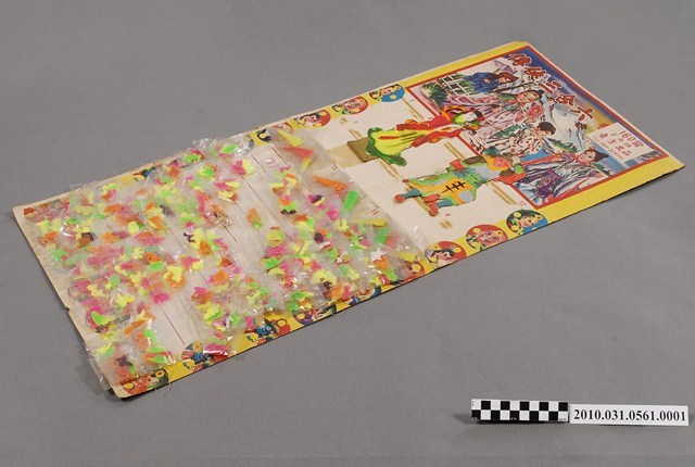 1.本物件為六合三俠傳抽抽樂獎品,為許多尪仔仙黏於一紙板上,紙板上方有六合三俠傳角色圖片左上有「六合三俠傳」紅色字樣,右上方有「160當 5角抽 東方出品」紅色字樣,下為黏貼獎品尪仔仙由大到小往下黏貼,下方較小尪仔仙外有塑膠袋包裝,兩側有尪仔標圖案為裝飾。塑膠袋及紙板皆有泛黃痕跡。