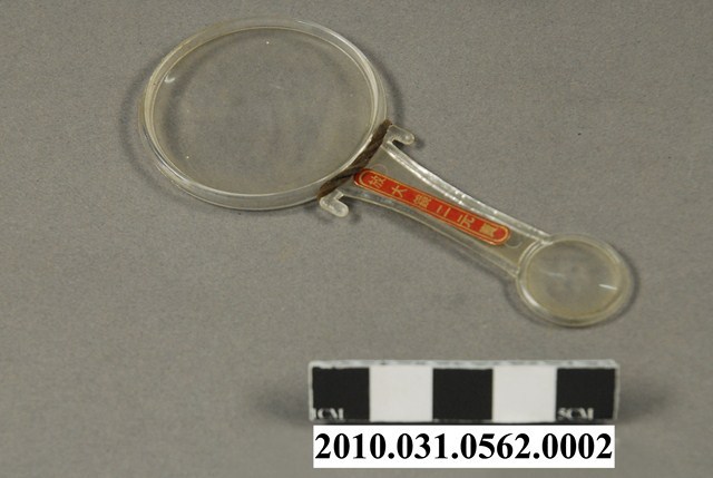 本文物為放大鏡。整支放大鏡為透明無色,一頭為大圓形,另一頭為小圓形,中間以握柄連接。大圓形與握柄連接處套有黑色繩狀物品,握柄處貼有一紅色長形貼紙,上有金色字樣,放大鏡二元賣。
