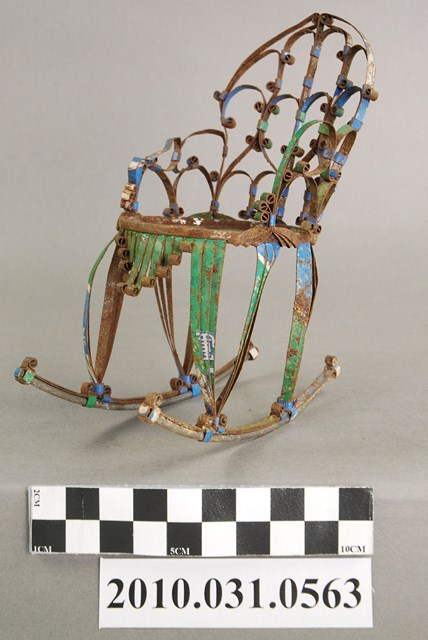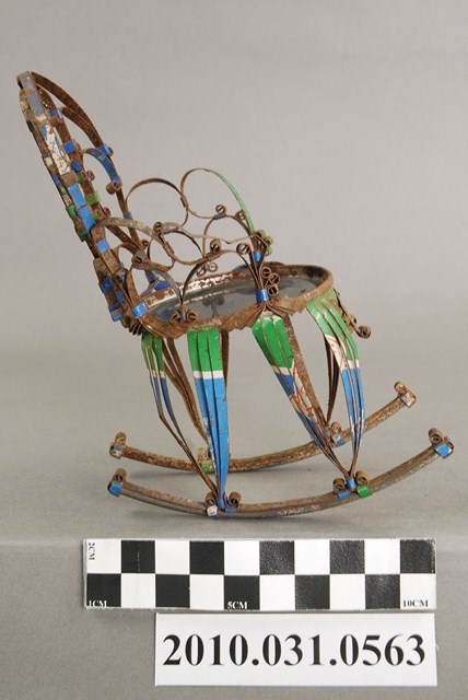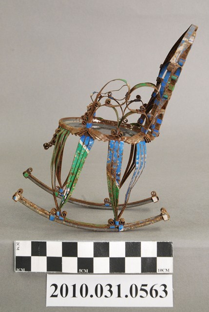本物件為鐵製搖椅,材質為鐵質,整體顏色各異,但皆有繡蝕,其裝飾特殊,有靠背,以薄鐵片構成,為簍空,鐵片裝飾成各式形狀,兩側皆有扶手,亦與靠背相同,鐵片裝飾成各式形狀,有四隻椅腳,每隻椅腳皆以三片一組、共兩組的鐵片組成,從上至下的顏色分層為綠、白、藍,最下方為弧形底座,可供乘坐者前後搖擺。