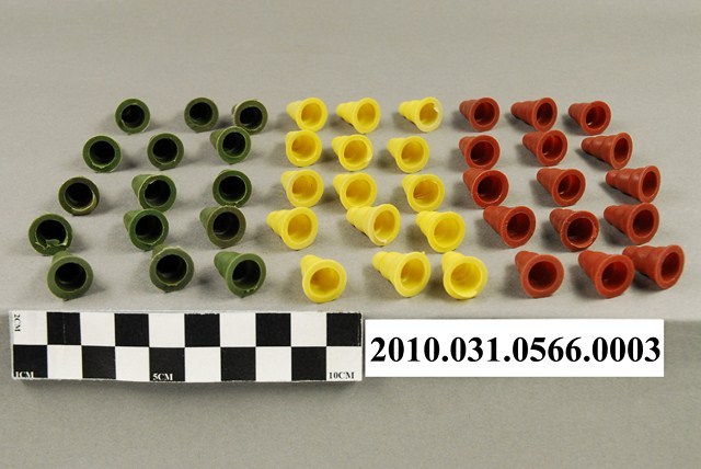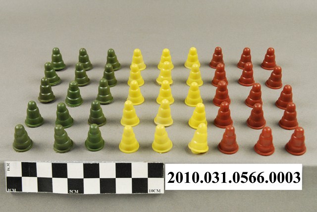 1.本物件為巨人牌跳棋遊戲棋子,由右至左分為紅色、黃色、綠色3個顏色。包含紅色跳棋15個、黃色跳棋15個、綠色跳棋15個。 2.跳棋可供3~6人遊玩,本物件為3人紅、藍、黃三色,棋子移動可在直線連接的相鄰六個分向進行,若相鄰位置已有棋子,該位置直線方向下個格子若無棋子,則可直接跳至該格,最先將對面同色格子占滿者即獲得勝利。