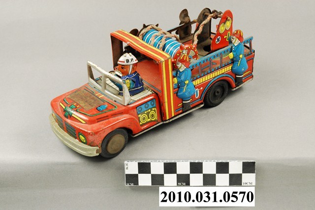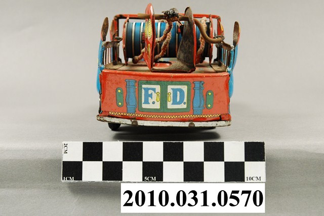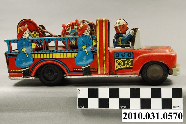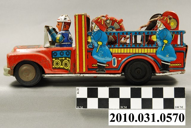 1.本物件為消防車鐵皮玩具,材質為金屬,整體造型是一輛消防車,車上有數名消防隊員。消防車車身以紅、黃、藍三色構成,主體為紅色,有一人坐在車輛前方駕駛車輛,其餘身穿藍色制服的隊員精神抖擻地站在車上,車斗上有藍色圓桶造型的器具,代表消防設備的管線。