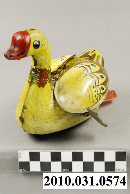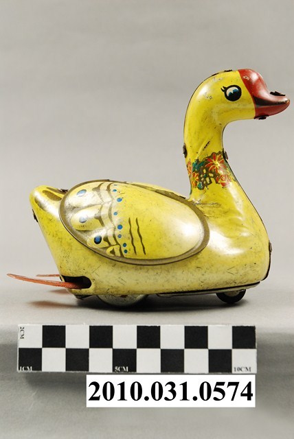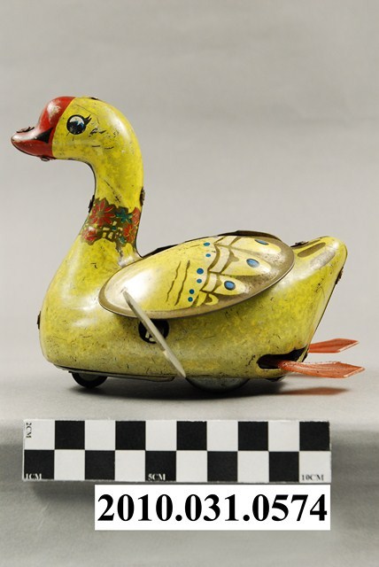 1.本物件為天鵝鐵皮玩具,材質為金屬,整體造型是天鵝的外型,天鵝的毛色以淺黃色為底色,翅膀上有藍色小點作為點綴圖樣。此天鵝有著俏皮眼睛,喙基部為紅色,長長的頸部有繽紛花樣作為裝飾,側身有發條,腳掌是橘色。轉動天鵝鐵皮玩具的側身發條,天鵝的腳掌部位會擺動,玩具下方亦有輪子可移動。