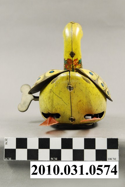 2.本物件屬鐵皮發條玩具,約於19世紀末,鐵皮玩具開始以機器生產,且將彩色花紋轉印在鐵皮上,故能呈現繽紛樣貌。